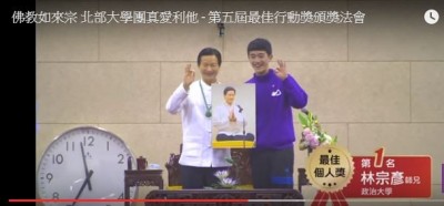 描述: 牛奶哥哥(右)獲得個人獎第一名,並上台和妙禪合照。(翻攝自YouTube)〔娛樂頻道/綜合報導〕原兒童台主持人「牛奶哥哥」林宗彥,日前被爆出不雅影片,他稱自己也是遭設計,日前Ptt有網友爆卦牛奶哥哥捧著妙禪神像,文中也附上網址。牛奶哥哥接受妙禪以手蓋頂祈福。(翻攝自YouTube)牛奶哥哥在影片中拿