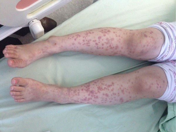 描述: 台中一名6歲女童感冒後2個多星期,小腿冒出幾顆小紅疹以為蚊子咬,卻愈長愈多,3天內就佈滿雙腿,紅疹也變成瘀青般的青紫色,非常嚇人,且合併下肢和關節腫痛,就醫發現罹患過敏性紫斑症,嚴重恐會腎衰竭、洗腎。台中醫院小兒科醫師洪千惠指出,過敏性紫斑症並不少見,雖中文名有過敏性,其實為免疫疾病,是病毒誘發體內過度的免疫反應引起,造成全身性血管炎,出現全身的突起性紫斑,主要在下肢和屁股,發生原因不明,但大多像罹患感冒後1、2週,身體免疫反應繼續作用過強而罹病。