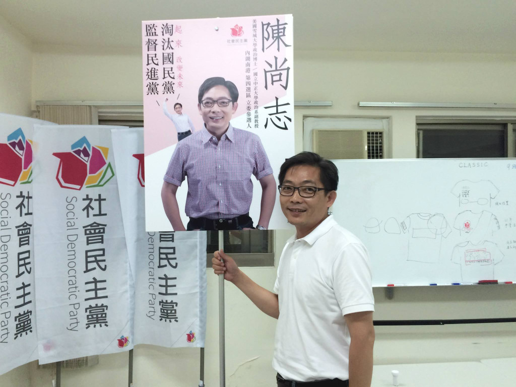 綠社盟立委參選人陳尚志自己DIY文宣手舉牌。(陳尚志臉書)【本文出處;更多精采報導,請上《民報: