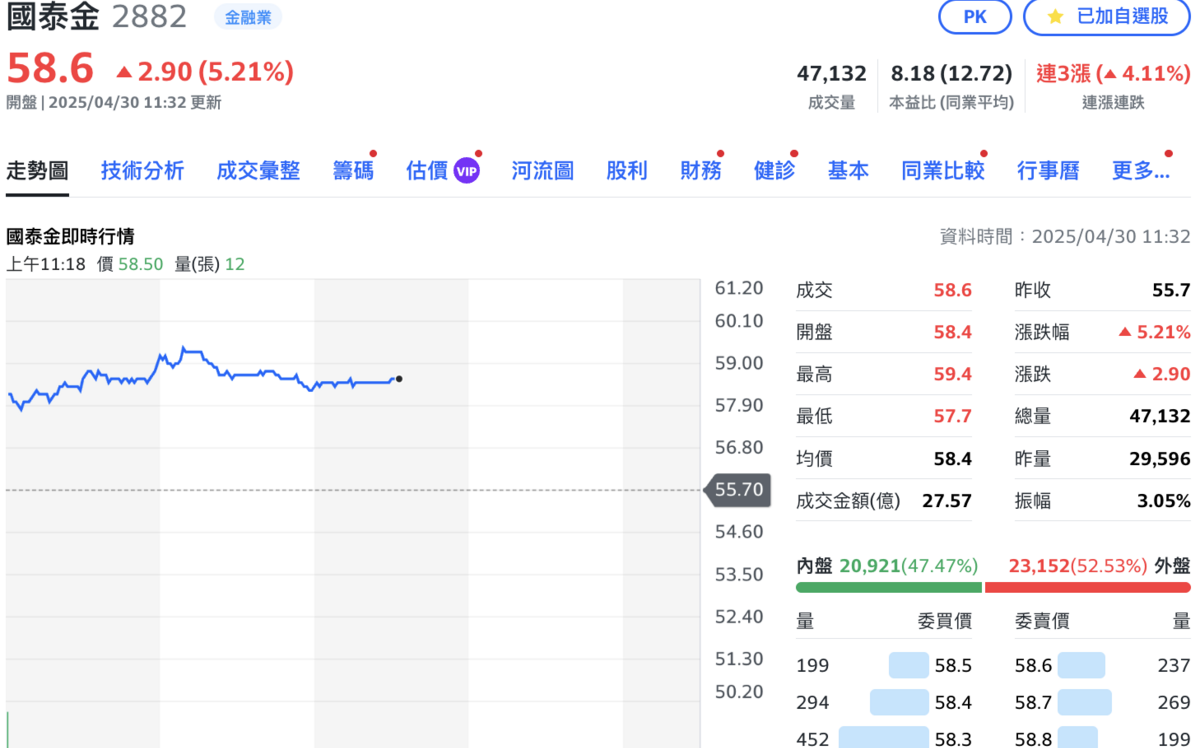 ![]() | 現金股利3.5元超給力!國泰金強彈逾5% 富邦金配息開獎倒數跟漲4% | 46萬名股東笑開懷 國泰金配發3.5元股利今股價強彈5% | 金控股「高配息」嗨漲! 國泰中信台新30日成交量放大股價收高 | |