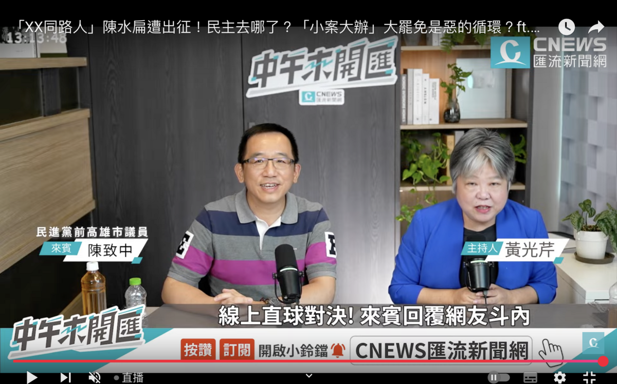 ![]() | 柯文哲被押!陳致中舉阿扁一路押到底:沒程序正義就沒實質正義 | 別貼「XX同路人」陳致中:就被出征好幾天、阿扁也很艱苦 | 特赦阿扁?陳致中苦回: 光芹姐做一集來訪問賴總統 | |