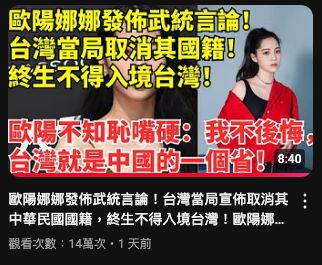 ![]() | 網亂傳「歐陽娜娜遭取消國籍」 陸委會澄清:偽造影片非事實! | 歐陽娜娜「取消國籍」終生禁入境台灣?陸委會說話了! | 網傳「歐陽娜娜被取消國籍」!陸委會澄清:虛假不實、惡意偽造 | |