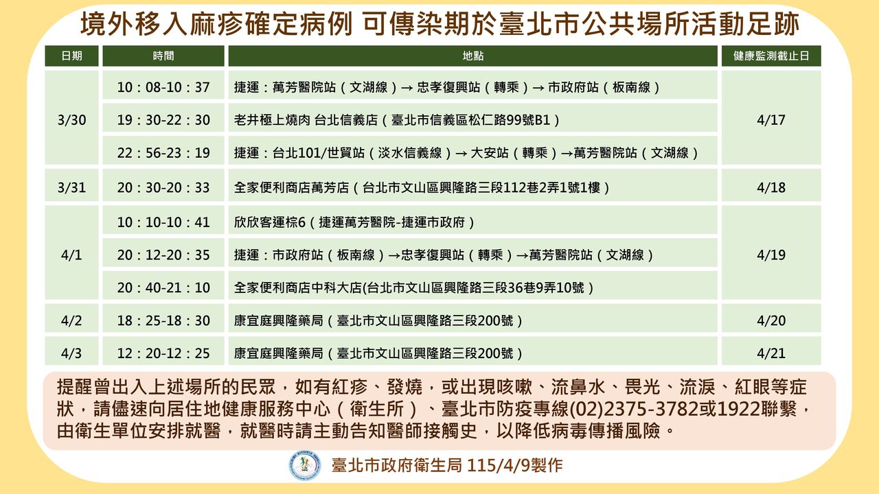 標題: 快訊/北市公布「新增麻疹個案」足跡 搭捷運公車、吃燒肉