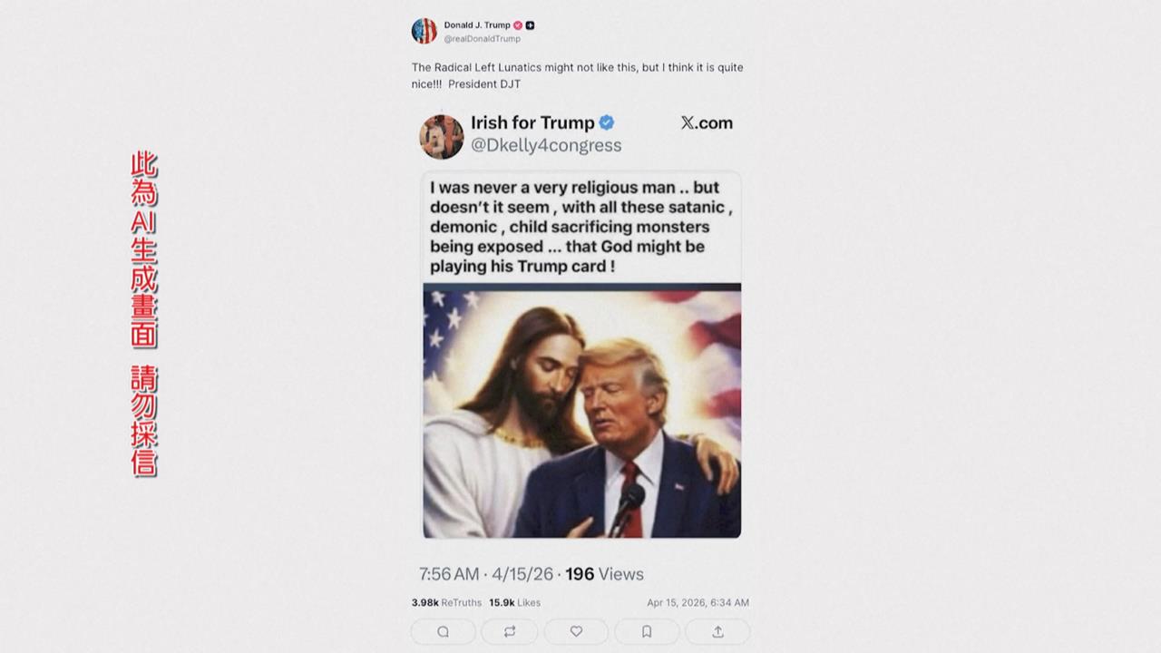 標題: 川普轉貼「耶穌擁抱AI圖」 諷左派可能不喜歡但他很愛