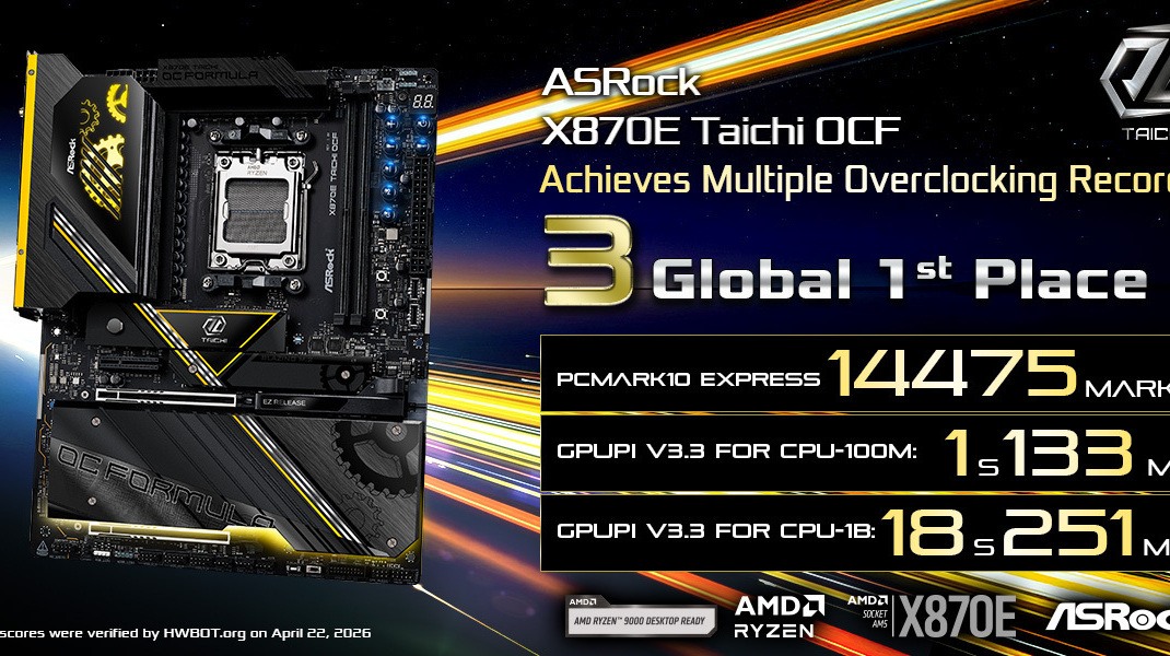 描述: 華擎科技宣布其旗艦主機板 ASRock X870E Taichi OCF 搭載 AMD Ryzen 9 9950X3D2 Dual Edition 處理器,創下多項超頻成績。 【以下內容為廠商提供資料原文】 專業超頻玩家 AKM 與 l0ud_sil3nc3 在多項效能測試平台中,將系統性能推向全新高度,奪得多項 Global 1st Place 紀錄及頂尖全球排名。這些成果再次展現 X870E Taichi OCF 極致的超頻實力與穩定可靠的表現。