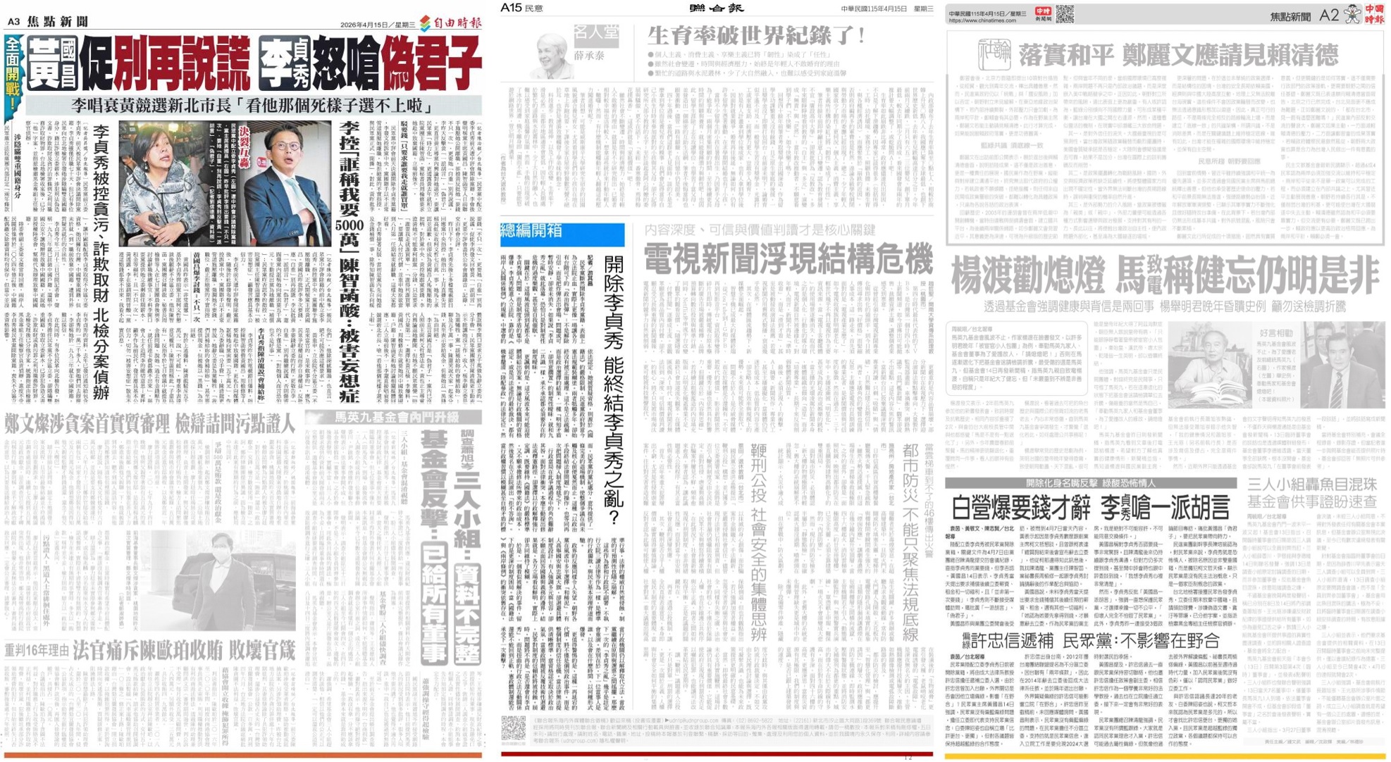 李貞秀被民眾黨開除後,本性盡露,毫無保留地反擊黃國昌,昨佔盡網路、媒體聲量。今天就自由時報最捧場,給予半版的篇幅,圖文並茂。